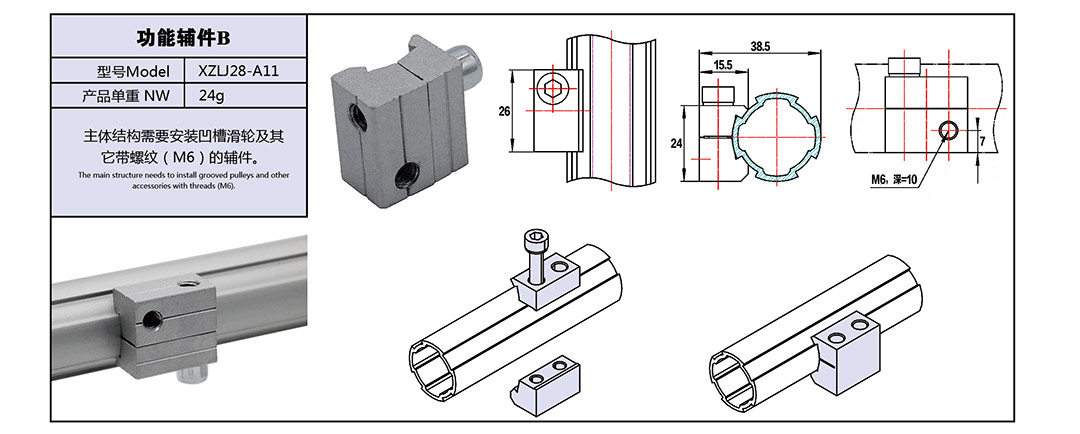 需安装凹槽滑轮及带螺纹(M6)的辅件