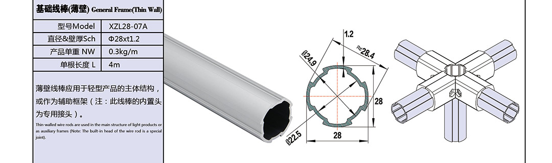 薄壁线棒应用于轻型产品的主体结构,或作为辅助框架(注:此线棒不适用所有内置接头)